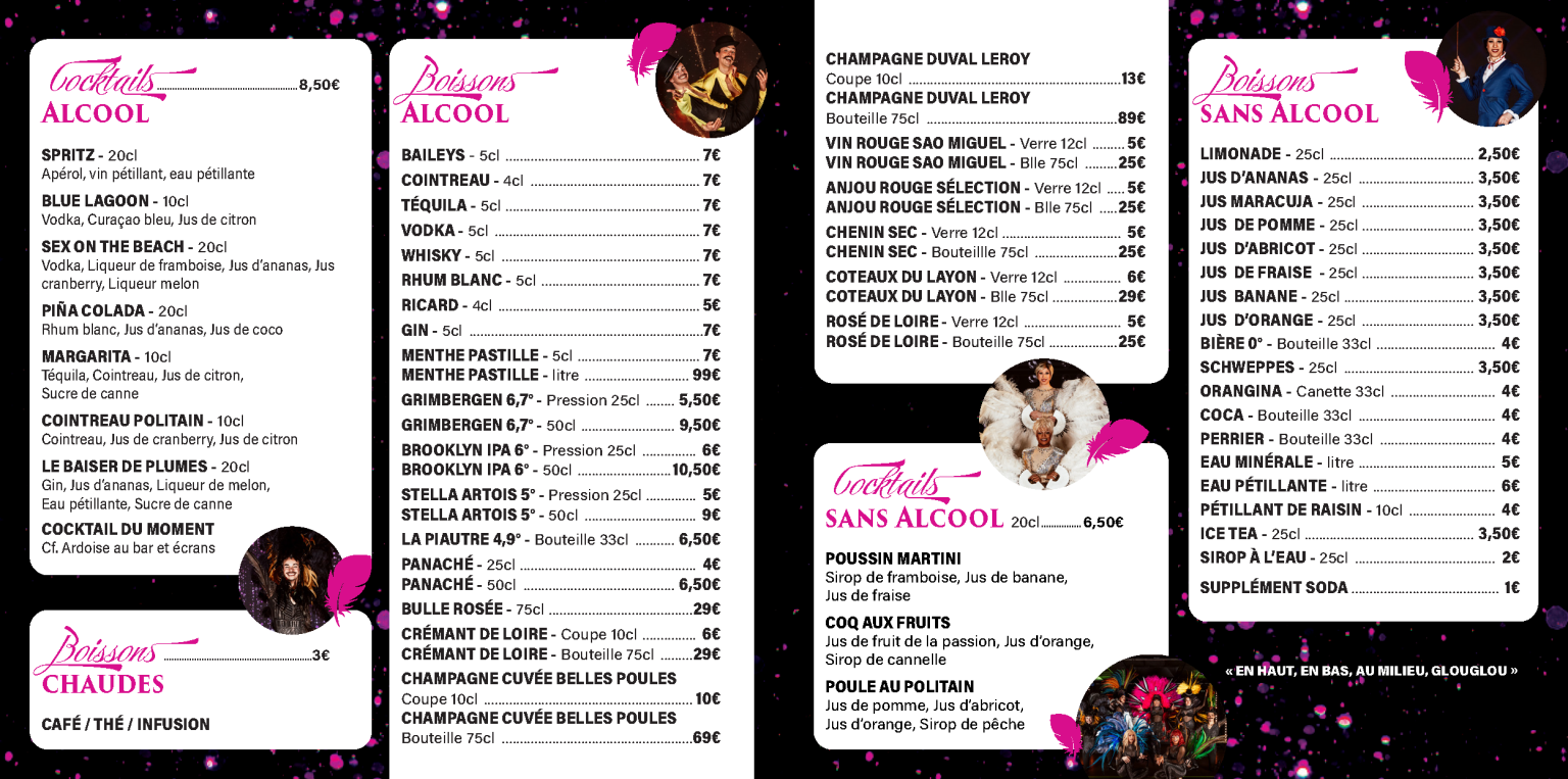 Au Cabaret des Belles Poules, le Bar Lounge vous accueille dans un univers décalé et féerique. Il est ouvert avant et après votre repas-spactacle. Veillez donc à prendre vos précautions et à anticiper vos commandes avant le spectacle ! Notre carte est disponible ci-contre et contient une variété de boissons alcoolisées** et non alcoolisées, telles que des bières**, des vins**, des spiritueux**, des cocktails classiques** et des créations spéciales** de notre barman. Bonne découverte !
