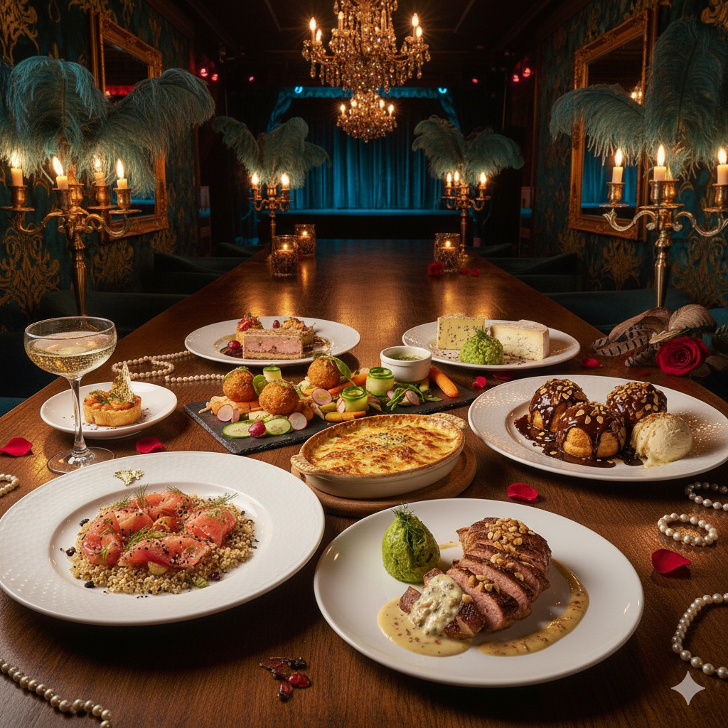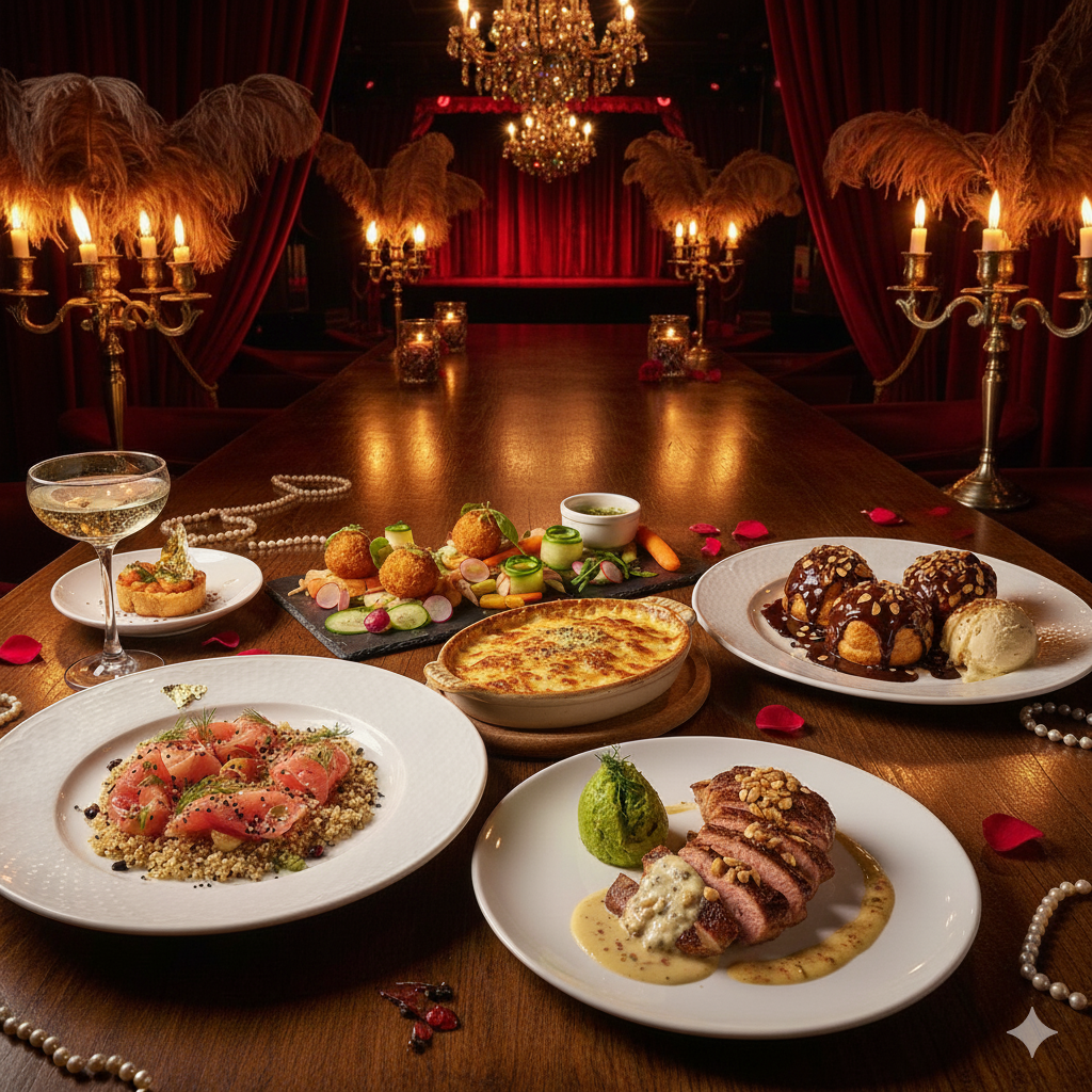 APÉRITIF DES BELLES POULES** (CRÉMANT - 10CL) & GRAVLAX DE SAUMON AU QUINOA ET SÉSAME, BILLES DE CHEVRE ET PETITS LÉGUMES CROQUANTS & FILET MIGNON DE PORC, CREME A L'AIL, MOUSSELINE D'ASPERGES VERTES ET GRATIN DE POMMES DE TERRE A LA MOZZARELLA & PROFITEROLES AU CHOCOLAT ET ECLATS D'AMANDES & CAFÉ